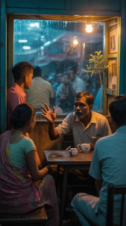 চায়ের দোকানে—ভেজা বাতাসে ধোঁয়া ওঠে কাপে