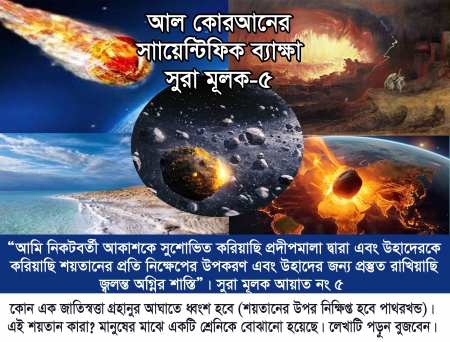 প্রিয় পাঠক, এই আয়াতে শয়তানের উপর নিক্ষিপ্ত জোতিস্কসমূহ বা উপকরনসমূহ বলতে গ্রহানুসমূহকেই বোঝানো হয়েছে। এবং উহাদের জন্য প্রস্তুত রাখিয়াছি জলন্ত অগ্নির শাস্তি বলতে এ্যাস্টির্য়েরড বেল্ট এলাকাকেই বোঝানো হয়েছে। আল্রাহ বলছেন তিনি গুহানুপুঞ্জ বা এস্টিরয়েড বেল্ট সৃষ্টি করেছেন পৃথিবীর বুকে মানুষ নামক শয়তানের প্রতি নিক্ষেপের উপকরন হিসেবে। সহজভাবে যদি বোঝার চেষ্টা করেন তাহলে বুঝবেন আল্লাহ রাব্বুল আলামিন গ্রহানুর আঘাতে পৃথিবীর মধ্যকার মানুষের একটি শ্রেনি শয়তানদের ধ্বংশস্তুপে পরিনত করার হুমকি দিচ্ছেন। পৃথিবীতে গ্রহাণুর আঘাত সত্যিই একটি বাস্তব ঝুঁকি, যা অতীতে বড় বিপর্যয় ঘটিয়েছে (যেমন ডাইনোসরের বিলুপ্তি এবং ভবিষ্যতে ঘটতে পারে, তবে NASA সহ মহাকাশ সংস্থাগুলো সম্ভাব্য বিপজ্জনক গ্রহাণু পর্যবেক্ষণ ও ট্র্যাক করছে; যদিও '2024-YR4' এর মতো কিছু গ্রহাণুর আঘাতের আশঙ্কা (২০৩২ সালে) একসময় থাকলেও, পর্যবেক্ষণের পর সেই ঝুঁকি কমে গেছে বা বাতিল হয়েছে। তবে বড় ধরনের গ্রহাণুর আঘাত বিরল হলেও তা বৈশ্বিক বিপর্যয় ঘটাতে সক্ষম।