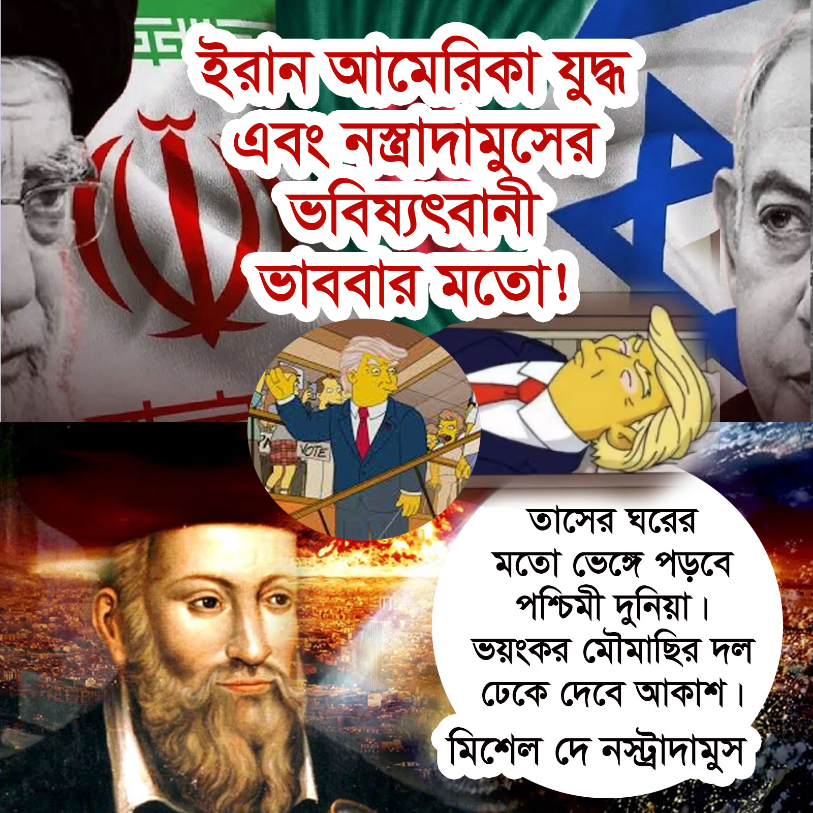 কিন্তু ইরানের এই উন্নত মিসাইল সক্ষমতা এবং সামরিক সরঞ্জমাদি বিশ্বের কিছু আলোডিত ভবিষ্যতবক্তার ভবিষ্যতবানীর দিকে ইঙ্গিত করছে। বিশেষ করে ফ্রান্সের ভবিষ্যতবক্তা নস্ত্রাদামুস। Nostradamus Dangerous Prediction: নস্ট্রাদামুসের ২০২৬ সালের হাড়-কাঁপানো ভবিষ্যদ্বাণী। ফরাসি ভবিষ্যদ্বক্তা মিশেল দে নোস্ট্রাদামুস (Michel de Nostredame)-এর ভবিষ্যদ্বাণীগুলি centuries (শতাব্দী) ধরে জন্য বেশ কিছু চাঞ্চল্যকর ভবিষ্যদ্বাণী নিয়ে আলোচনা চলছে। নস্ত্রাদামুস লিখেছেন-তাসের ঘরের মতো ভেঙ্গে পড়বে পশ্চিমী দুনিয়া। ভয়ংকর মৌমাছির দল ঢেকে দেবে আকাশ। এখানে ইরানি কামিকাজি ড্রোনের আত্মঘাতি হামলায় আমেরিকার দিশেহারার কথা তুলে ধরা হয়েছে। 2026 নিয়ে নস্ত্রাদামুস এর ভবিষ্যৎবানী সতিই চমকপ্রদ তথ্য দেয়। আমেরিকান ভবিষ্যৎবক্তা জিন ডিকশনের।“দি ম্যান অব দি মিডল ইষ্ট হু ইজ টুমরো” নামের মধ্যপ্রাচের একজন দূধর্ষ মানুষের কথা উল্লখ করা হয়েছে। যে মানুষটির সাথে যুদ্ধ করতে গিয়ে পশ্চিমা সভ্যতা ধ্বংশস্তুপে পরিনত হবে। এবং মধ্যপ্রাচের এই মানুষটির শত শত জাহাজ ভর্তি গোলা ইউরোপিয় ইউনিয়নে আঘাত হানবে। এবার আসুন আমরা আলোচনা করি বিশ্বখ্যাত আমেরিকান অ্যানিমেটেড ফিল্ম সিম্পসনস নিয়ে। যা ১৯৮৯ সালে প্রকাশিত কার্টুন সিম্পসনস (The Simpsons) যা ব্যপক আলোচনার বিষয়বস্তু হয়ে পড়েছিলো। ম্যাট গ্রোনিং সৃষ্ট এই ব্যাঙ্গাত্মক কার্টুনটি স্প্রিংফিল্ড শহরের কাল্পনিক সিম্পসন পরিবারের দৈনন্দিন জীবন, সমাজ ও রাজনীতি নিয়ে তৈরি। এটি তার নির্ভুল ভবিষ্যতের ভবিষ্যদ্বাণীর জন্য পরিচিত। ১৯৯৮ সালে সম্প্রচার হয় দ্য সিম্পসন্সের ‘হোয়েন ইউ ডিশ আপুন অ্যা স্টার’ পর্বটি। এখানে দেখানো হয়, ডিজনি টুয়েন্টিএথ সেঞ্চুরি কোম্পানিটি ফক্স কোম্পানি কিনে নিচ্ছে। আশ্চর্যজনক হলেও সত্য যে, ২০১৭ সালের ১৪ ডিসেম্বর ৫২.৪ বিলিয়ন ডলারের বিনিময়ে ডিজনি টুয়েন্টি-ফার্স্ট সেঞ্চুরি কোম্পানিটা ফক্স কিনে নেয়। এই সিম্পসন কাটুনে ইরান ও ইসরাইল যুদ্ধে একটি ভবিষ্যতবানী বর্ননা করা আছে সাংকেতিকভাবে। কাটুনটিতে আমেরিকার প্রেসিডেন্ট ট্রাম্পের প্রেসিডেন্ট হওয়ার মতো ঘটনারও বর্ণনা করা আছে। শুধু তাই নয় কোন এক ১২ এপ্রিল ট্রাম্প নামের আমেরিকান প্রেসিডেন্ট এর মৃত্যুর ঘটনারও বর্ননা দেওয়া হয়েছে।
