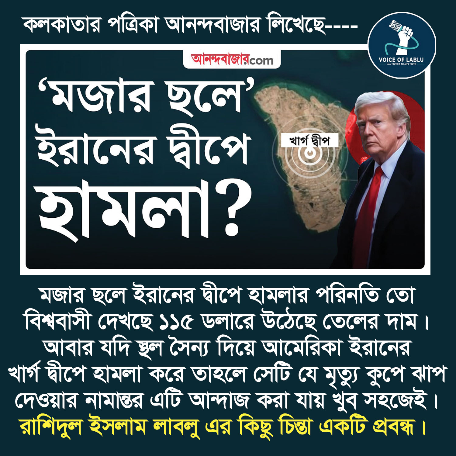 বিশ্বের তাবৎ ওয়ার স্পেশালিস্টরা বলতেছেন স্থল অভিযান হবে আত্মহত্যার শামিল। তারপরও ইহদী দালাল রাজনৈতিক বিশ্লেষকের বক্তব্যের বিরুদ্ধাচারী কিছ যুক্তি তুলে না ধরলেই নয়। ধরে নিলাম ১০ হাজার সৈন্য খড়গে নেমে দখলে নিল, মানলাম, তো তারা খাবে কি, রসদ কই পাবে, কিভাবে পাবে? আকাশ থেকে F-35, B-52 দিয়ে রসদ নামাবে? ১০ হাজার যোদ্ধাকে এই দ্বীপ দখলে রাখতে কতদিন থাকতে হবে? শিপে রসদ পাঠাবে কিভাবে? আমেরিকা অজেয় বাট আটলান্টিক এর ওপার থেকে তারা খুব কম যুদ্ধেই সুবিধা করতে পেরেছে। ইতিহাসে ১৯৪৫ এর পর তারা সবচেয়ে নাজুক অবস্থায় আছে । স্বয়ং চীফ অফ জেনারেল স্টাফই এই যুদ্ধে যেতে চায় নাই আমেরিকার সেনাবাহিনী নিয়া।