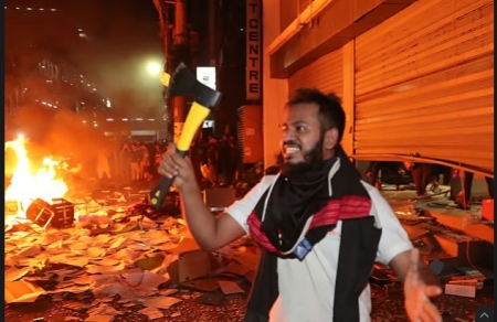 হামলায় অংশ নেওয়া মব বাহিনীর এক সদস্য কুড়াল হাতে উল্লাস প্রকাশ।