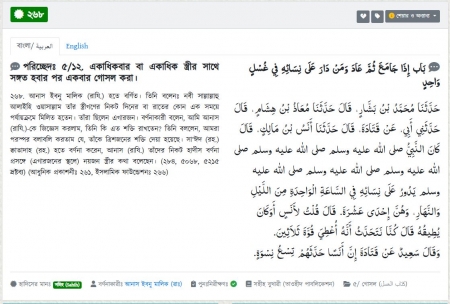 ২৬৮. আনাস ইবনু মালিক (রাযি.) হতে বর্ণিত। তিনি বলেনঃ নবী সাল্লাল্লাহু আলাইহি ওয়াসাল্লাম তাঁর স্ত্রীগণের নিকট দিনের বা রাতের কোন এক সময়ে পর্যায়ক্রমে মিলিত হতেন। তাঁরা ছিলেন এগারজন। বর্ণনাকারী বলেন, আমি আনাস (রাযি.)-কে জিজ্ঞেস করলাম, তিনি কি এত শক্তি রাখতেন? তিনি বললেন, আমরা পরস্পর বলাবলি করতাম যে, তাঁকে ত্রিশজনের শক্তি দেয়া হয়েছে। সা‘ঈদ (রহ.) ক্বাতাদাহ (রহ.) হতে বর্ণনা করেন, আনাস (রাযি.) তাঁদের নিকট হাদীস বর্ণনা প্রসঙ্গে (এগারজনের স্থলে) নয়জন স্ত্রীর কথা বলেছেন। (২৮৪, ৫০৬৮, ৫২১৫ দ্রষ্টব্য) (আধুনিক প্রকাশনীঃ ২৬১, ইসলামিক ফাউন্ডেশনঃ ২৬৬)