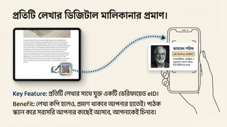 ৩. চুরি হলেও পাঠক আপনার কাছেই আসবে: যেকোনো লেখা স্ক্যান করলেই সরাসরি শনাক্ত করা যায় মূল লেখক ও তার সম্পূর্ণ পোর্টফোলিও। এমনকি আপনার লেখা কেউ কপি করলেও—প্রমাণ থাকবে আপনার হাতেই, আর পাঠক স্ক্যান করে সরাসরি আপনার কাছেই আসবে, আপনাকে চিনবে, ফলো করবে।