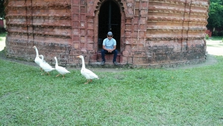 সীমানা প্রাচীরের বাইরে লোকের বাড়ি-ঘর। রাস্তার সাথে একটি দোকানে একটি ছেলেকে দেখে ডাকলাম। ছেলেটির নাম-হৃদয়। ওকে দিয়ে কিছু ছবি তুলিয়ে নিলাম, কয়েকটি রাজহাঁস ঢুকে পড়লো ছবির ফ্রেমে। রোদ চড়ে গেছে বেশ, আমাকে আবার যেতে হবে মধ্যযুগে গোড়াপত্তন হওয়া প্রসিদ্ধ গ্রাম নলিয়ায়। হৃদয়কে ধন্যবাদ দিয়ে রাস্তায় এসে দাঁড়ালাম। অল্পক্ষণ অপেক্ষার পর একটি অটো এলে তাতে চড়ে বসলাম।