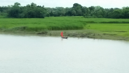 লাল রঙের পাল তোলা একটা ছোট নৌকা দেখতে পেলাম সবুজ ডাঙার পাশ দিয়ে উত্তরদিকে চলেছে, নীল আকাশ আর সাদা মেঘের ছায়া পড়েছে জলে; যেন আবহমানকালের দৃশ্য, হাজার বছর আগেও ছিল, এখনো আছে। মাগুরার দিকে নদীর ধারে একটা বটগাছ চোখে পড়লো, বটগাছের ছায়া লোভ দেখালেও অনেকটা দূর হেঁটে যেতে হবে বলে লোভ সংবরণ করতে হলো। মাগুরার দিকে ঘন সবুজ-গাছপালা আর মধ্যে মধ্যে ঘরবাড়ি। ফরিদপুরের দিকে ঘন সবুজ ফসলি জমি-গাছপালা, অনেকটা দূরে লোকালয়।