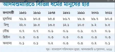 কাছের-মানুষ বলেছেন: ১৯৭৪ সালের আদমশুমারি অনুসারে দেশের হিন্দু জনসংখ্যা ছিল ১৩ দশমিক ৫ শতাংশ (সংখ্যায় ১ কোটি ৩ লাখ ১৩ হাজার)। সর্বশেষ ২০১১ সালের আদমশুমারি অনুসারে এটি দাঁড়িয়েছে ৮ দশমিক ৫ শতাংশে (সংখ্যায় ১ কোটি ২৭ লাখের কিছু বেশি)। অর্থাৎ হিন্দু জনসংখ্যা সংখ্যায় কমেনি, তবে শতাংশের হার কমেছে (সূত্র:সূত্র: প্রথম আলো)। আপনার প্রথম টেবিলটি যেই রিপোর্ট থেকে নিয়েছেন, আমিও সেই রিপোর্ট থেকেই তথ্য দিয়েছি।