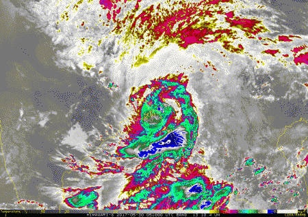 ছবি ৬, বঙ্গোপসাগরের পানির তাপমাত্রা ও ঘূর্ণিঝড় মোরা এর কেন্দ্রের ঘূর্ণন চিত্র (কৃতজ্ঞতা: Cooperative Institute for Meteorological Satellite Studies, Space Science and Engineering Center, University of Wisconsin-Madison)। ছবির ডান দিকের স্কেল বঙ্গোপসাগরের পানির তাপমাত্রা নির্দেশ করে।