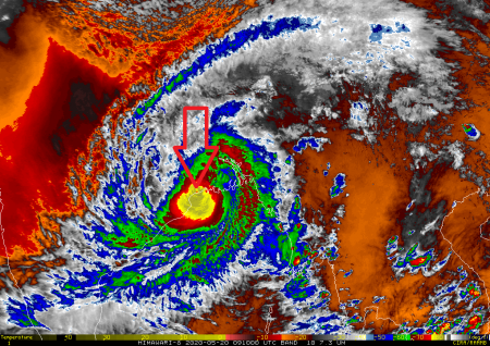দুপুর ১ টায় জাপানের কৃত্রিম ভূ-উপগ্রহ হিমাওয়ারি-৮ থেকে প্রাপ্ত ইনফ্রারেড চিত্র যা সাধারণত বায়ুতে মেঘের পরিমাণ নির্ধারণে ব্যবহার করা হয়ে থাকে। ঘূর্ণিঝড় কেন্দ্রের ৩ ভাগের ১ ভাগ ইতিমধ্যেই স্থল ভাগে প্রবেশ করেছে।