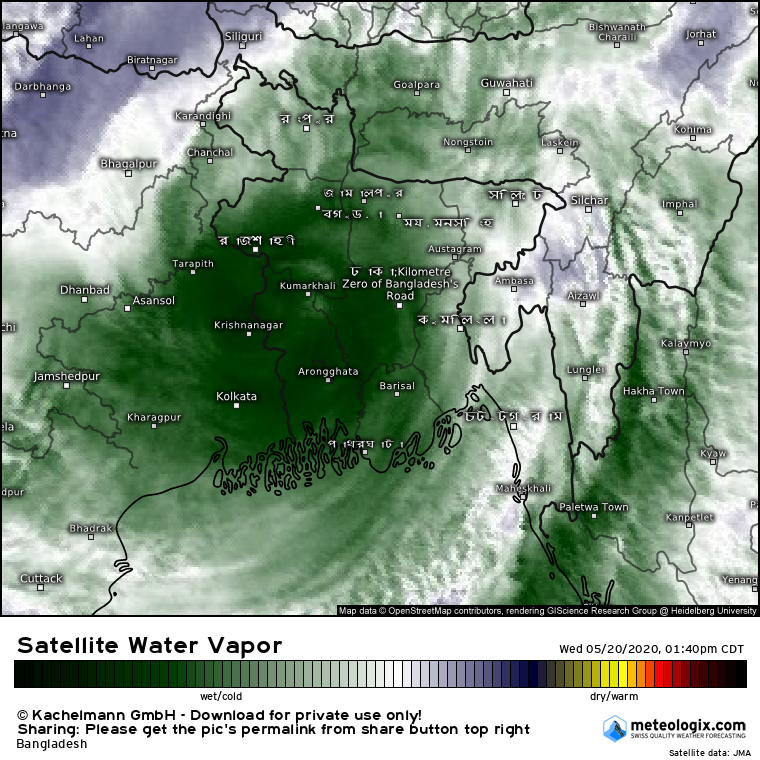 কৃত্রিম ভূ-উপগ্রহ থেকে প্রাপ্ত চিত্র বিশ্লেষণ করে দেখা যাচ্ছে (মেঘের তাপমাত্রা অনেক কমে গেছে) ঘূর্ণিঝড় আম্পান ইতিমধ্যে অনকে শক্তি হারিয়েছে। ঘূর্ণিঝড় এর প্রভাবে সৃষ্ট মেঘ পুরো বাংলাদেশে ছেয়ে গেছে। ঢাক শহরকে কেন্দ্র করে ২০০ কিলোমিটার ব্যাসার্ধ নিয়ে যদি একটি বৃত্ত আকা যায় তার রূপ যেমন হবে ঘূর্ণিঝড় এর কারণে সৃষ্ট মেঘের বর্তমানে সেই অবস্থায় রয়েছে।