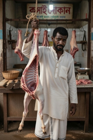 ক্যামেরা থামে রতনের দোকানে। পাঁচ বাই পাঁচ ফিটের ছোট কাঠের চৌকি। সামনে একটা পুরো খাসির শব ঝুলছে — চামড়া ছাড়ানো, লাল টকটকে।