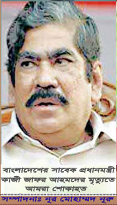 বাংলাদেশের সাবেক প্রধানমন্ত্রী, প্রবীণ রাজনীতিবিদ ও জাতীয় পার্টির একাংশের চেয়ারম্যান কাজী জাফর আহমদ ইন্তেকাল করেছেন।(ইন্নালিল্লাহি ওয়াইন্না ইলাইহি রাজিউন)। আজ ২৭ আগস্ট ২০১৫ ইং বৃহস্পতিবার সকাল সাড়ে ৭টায় রাজধানী গুলশানের বাসায় তিনি হঠাৎ অসুস্থ হয়ে পড়েন। পরে রাজধানীর ইউনাইটেড হাসপাতালে নেওয়া হলে কর্তব্যরত চিকিৎসক তাকে মৃত ঘোষণা করেন। কাজী জাফর আহমদের এপিএস কামরুজ্জামান রনি এ তথ্য নিশ্চিত করেছেন। কাজী জাফর আহমদ মৃত্যুর আগ পর্যন্ত জাতীয় পার্টির একাংশের চেয়ারম্যান ছিলেন। ১৯৮৬-১৯৯৬ পর্যন্ত পরপর তিনবার জাতীয় সংসদ সদস্য নির্বাচিত হন। গত ৫ জানুয়ারির নির্বাচনের আগে তিনি ‘নির্বাচন বর্জনের’ পক্ষে অবস্থান নিয়ে নিজের অনুসারীদের নিয়ে এইচ এম এরশাদের নেতৃত্বাধীন জাতীয় পার্টি থেকে পদত্যাগ করে আলাদা দল গঠন করেন। যোগ দেন বিএনপির চেয়ারপারসনের নেতৃত্বাধীন খালেদা জিয়ার জোটে। তিনি এই জোটের শীর্ষনেতাদের অন্যতম ছিলেন। মুত্যুকালে তাঁর বয়স হয়েছিল ৭৬ বছর। কাজী জাফর হৃদরোগসহ বিভিন্ন শারীরিক সমস্যায় ভুগছিলেন। মৃৃত্যুকালে তিনি তিন মেয়ে, স্ত্রী, আত্মীয়স্বজন, বন্ধুবান্ধবসহ অসংখ্য গুণগ্রাহী রেখে গেছেন। বাংলাদেশের সাবেক প্রধানমন্ত্রী ও প্রবীণ এই রাজনীতিবিদের মৃত্যুতে শ্রদ্ধাঞ্জলি।