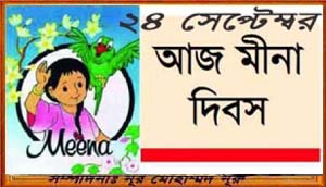 আজ ২৪ সেপ্টেম্বর-মীনা দিবসঃ মীনাকে তো আমরা সবাই চিনি। মীনা একটি প্রতিকী চরিত্র। এই চরিত্রের মাধ্যমে শিশুদের আধিকার, শিক্ষা, সাংস্কৃতি, বিনোদন, শারীরিক ও মানসিক ভাবে বেড়ে ওঠার চিত্র ফুটে উঠে। মীনা কার্টুনে একটি পরিবারের কাহিনী ফুটে উঠেছে। সেখানে মীনা সময়মত স্কুলে যায়, বন্ধুদের সঙ্গে খেলাধুলা করে, পরিবারের বিভিন্ন কাজে সহযোগীতা করে,অন্যের বিপদে সাহায্যের জন্য এগিয়ে আসে। আমাদের প্রিয় সেই মীনার টিয়া পাখি মিঠু আর ছোট ভাই এর নাম রাজু। সে কিন্তু গ্রামের মেয়ে। ছোট ভাই রাজু ছাড়াও তার পরিবারে আছে বাবা-মা, বোন আর দাদী। আদরের টিয়া পাখি মিঠু সারাক্ষণ মিনার সঙ্গেই থাকে। কার্টুনটি আমাদের অনেকেরই প্রিয় কারণ এখানে মীনার অনেক বুদ্ধিমত্তা ও সাহসিকতা আমরা দেখেছি। সবার জন্য ভালো কিছু করতে মীনা সবার আগেই থাকে। সবসময়ই তার আগ্রহ, কিসে এলাকার মানুষের উপকার হয়। কিভাবে বুদ্ধি করে সে চোর ধরেছিলো তা তো আমরা দেখেছি। এতে অবশ্য এটাও বোঝানো হয়েছে যে শিক্ষা কতোটা গুরুত্বপূর্ণ। শুধু কি তাই, মীনা তার বাবাকে ঠকে যাবার হাত থেকেও বাঁচিয়েছিলো। এজন্যই মীনা কার্টুন সারা পৃথিবী জুড়েই ব্যাপক ভাবে জনপ্রিয়। উল্লেখ্য, জাতিসংঘের শিশু সুরক্ষা বিষয়ক অধিসংস্থা ইউনিসেফ-এর আহ্বানে প্রতি বছর ২৪ সেপ্টেম্বর মীনা দিবস পালিত হয়ে থাকে। এজন্য বছরের ২৪ সেপ্টেম্বর মিনার জন্মদিন হিসেবে পালন করা হয়। মীনা দিবসে বিশ্বের সব শিশুদের সম অধিকার প্রতিষ্ঠিত হোক-–এই প্রত্যাশা আমাদের।