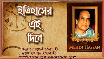উপমহাদেশের অন্যতম প্রবাদপ্রতিম গায়ক ও সুরস্রষ্টা এবং পাকিস্তানের চলচ্চিত্র জগতের উজ্জ্বল নক্ষত্র কণ্ঠশিল্পী মেহেদী হাসান। ' মেহবুব সুর'- এর অধিকারী গজল সম্রাট মেহেদী হাসানের গজল শুনে কিংবদন্তী কণ্ঠশিল্পী লতা মুঙ্গেশকর তাঁর বলেছিলেন, ' মেহেদী হাসানের কণ্ঠে বাস করেন স্বয়ং ঈশ্বর।' আর এক কিংবদন্তী গায়ক মো. রফি বলেছেন,' আমরা গান করি আমজনতার জন্য আর মেহেদী হাসান গান করেন আমাদের জন্য।' এ জন্যই বোধ হয় তাঁকে বলা হয় শাহেনশাহ-ই-গজল । শৈশব থেকেই সংগীতের ধ্বনি মাধুর্য তাঁকে আন্দোলিত করেছে। হাতেখড়ি বাবা-চাচার কাছে। পাকিস্তানী ফিল্মী গানের সর্বকালের সেরা গানগুলো মেহেদী হাসানের গাওয়া। তাঁর গায়কী জীবনে খ্যতি এন দেয় বিখ্যাত সেই গান ' গুলুমে রাঙ্গ ভারে'। এরপর আর পেছনে ফিরে তাকাতে হয়নি। পঁচিশ হাজারেরও বেশি গান গেয়েছেন তিনি। দুরূহ গজলও তাঁর কণ্ঠে কেমন হূদয়ছোঁয়া হয়ে ওঠে। কখনো উর্দু সাহিত্যের ছাত্র না হয়েও উর্দু গজলের শব্দ ও সুর নিয়ে খেলা করেছেন তিনি। উর্দু গজল ছাড়াও বাংলা গানেও রয়েছে তাঁর স্মরণযোগ্য অবদান। তাঁর গাওয়া বাংলা গান, 'হারানো দিনের কথা মনে পড়ে যায়'; 'ঢাকো যত না নয়ন দুহাতে'; 'তুমি যে আমার' প্রভৃতি গান বাংলাদেশের সংগীত প্রেমিরা চিরদিন মনে রাখবে। পাকিস্তান সরকারের তরফে তমঘা-ই-ইমতিয়াজ, প্রাইড অব পারফরম্যান্স এবং হিলাল-ই-ইমতিয়াজ এবং নেপাল সরকারের পক্ষ থেকে গোর্খা দক্ষিণা বাহু উপাধিতে ভূষিত হয়েছেন। দীর্ঘদিন অসুস্থতার পর ২০১২ সালের আজকের দিনে এই নশ্বর পৃথিবী থেকে তাঁর মহাপ্রয়ান ঘটে। আাজ তাঁর ৬ষ্ঠ মৃত্যুবার্ষিকী। কিংবদন্তি গজল সম্রাট মেহেদী হাসানের মৃত্যুদিনে আমাদের গভীর শ্রদ্ধাঞ্জলি।