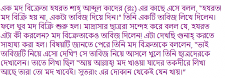 তখন অধার্মিক মাছটি উচ্চস্বরে আকুল হয়ে আল্লাহকে ডাকতে লাগলো । জেলে বউ মাছটি কাটতে যাবে এমন সময় জেলে হন্তদন্ত হয়ে এসে বউকে বললো -- ও বউ মাছ দুটো কি কেটে ফেলেছিস ? জেলে বউ বললো - এখনো কাটিনি , এই ছাই মাখাচ্ছিলাম কাটবো বলে। তুমি এমন হাঁপাতে হাঁপাতে এলে কেন, কি হয়েছে ?