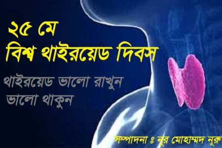 আজ ২৫ মে, বিশ্ব থাইরয়েড দিবস। বিশ্বব্যাপী ৭৫ কোটি মানুষ থাইরয়েড সমস্যায় ভুগছেন। এটা একটি হরমোনজনিত সমস্যা। ঘাড়ের কাছে থাইরয়েড গ্ল্যান্ড থেকে নিঃসরিত হরমোন শরীরের মেটাবলিজমকে নিয়ন্ত্রণ ও শরীরের প্রতিটি কোষকে প্রভাবিত করে। হরমোন শরীরের শক্তি, পুষ্টি ও অক্সিজেন উৎপাদন করতে সহায়তা করে। এর ব্যতিক্রম হলেই শরীরে নানা ধরনের সমস্যা দেখা দেয়।থাইরয়েড সমস্যা হলে হৃদস্পন্দন হ্রাস পায়, ঠান্ডায় স্পর্শকাতরতা বাড়ে, হাতে অবশ অবশ অনুভূত হয়ে ঘাড়ের পরিবর্ধন শুরু হয়। এছাড়া কোষ্ঠকাঠিন্য, মেয়েদের মাসিকে প্রচুর রক্তপাত হয় এবং চুল ও ত্বকে শুষ্কতা দেখা দেয়। এছাড়া থাইরয়েড গ্ল্যান্ডে সমস্যা হলে মৃদু থেকে তীব্র ব্যথা অনুভূত হয়, ঘাড় নড়াচড়া করলে অথবা কোনো কিছু গিলে খেতে গেলে অস্বস্তি অথবা ব্যথা হয়ে থাকে। সর্দি, হাম অথবা মাম্পসের মতো ভাইরাসজনিত রোগের সময় এ রোগটি দৃশ্যমান হয় বেশি। বাংলাদেশ এন্ডোক্রাইন সোসাইটি (বিইএস) তথ্যমতে, দেশে বর্তমানে অন্তত ৫ কোটি থাইরয়েড রোগী রয়েছে। এর বেশির ভাগই নারী। সাধারণত এক জন পুরুষের বিপরীতে ১০ জন নারী থাইরয়েড রোগে আক্রান্ত বলে জানান সংশ্লিষ্ট বিশেষজ্ঞরা। এদের মধ্যে ৩ কোটি রোগীই জানে না, তারা এ রোগে আক্রান্ত। ২০ থেকে ৩০ বছর বয়সের মধ্যে এ রোগে আক্রান্ত হবার সম্ভাবনা বেশি। এছাড়া প্রাপ্ত বয়স্ক পুরুষ ও নারীদের মধ্যে এর হার ৩.৯ শতাংশ থেকে ৯.৪ শতাংশ হারে থাকতে পারে। শিশুদেরও থায়রয়েডের হরমোন ঘাটতি জনিত সমস্যা হতে পারে। থায়রয়েডের হরমোন ঘাটতি হলে শিশুদের দৈহিক ও মানসিক বৃদ্ধি ব্যাহত হয়। পরর্বতী সময়ে দৈহিক বৃদ্ধির সমতা আনা গেলেও মেধার উন্নতি করা সম্ভব হয় না।এ ব্যাপারে সচেতনতা বাড়াতে ২০০৯ সাল থেকে বিশ্বব্যাপী দিবসটি পালিত হয়ে আসছে। আমাদের দেশে সরকারিভাবে এ দিবসটি উদযাপিত হয় না। তবে বিভিন্ন সংগঠন গত কয়েক বছর ধরে দিবসটি যথাযথভাবে পালন করে আসছে। দিবসটি উপলক্ষে বিভিন্ন সরকারি-বেসরকারি হাসপাতালে আলোচনা সভা, শোভাযাত্রাসহ নানা সচেতনতামূলক কর্মসূচি পালন করা হবে।