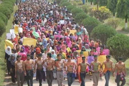 মিছিলের সামনের দিকের যুবকদের গায়ে শার্ট নেই; সেক্স-মিছিলের মত দেখাচ্ছে!