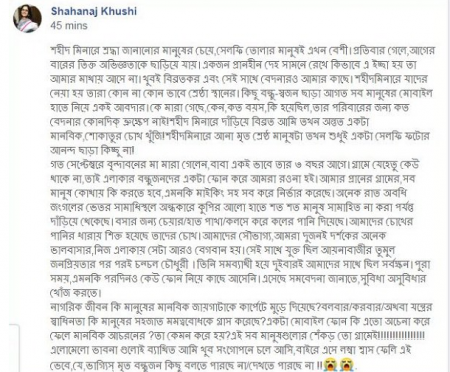 শাহনাজ খুশি লিখেন: ‘‘শহীদ মিনারে শ্রদ্ধা জানানোর মানুষের চেয়ে, সেলফি তোলার মানুষই এখন বেশী। প্রতিবার গেলে, আগের বারের তিক্ত অভিজ্ঞতাকে ছাড়িয়ে যায়। একজন প্রাণহীন দেহ সামনে রেখে কিভাবে এ ইচ্ছা হয় তা আমার মাথায় আসে না। খুবই বিব্রতকর এবং সেই সাথে বেদনারও আমার কাছে। শহীদ মিনারে যাদের নেয়া হয় তারা কোন না কোন ভাবে শ্রেষ্ঠা স্থানের। কিছু বন্ধু-স্বজন ছাড়া আগত সব মানুষের মোবাইল হাতে নিয়ে একই আবদার। কে মারা গেছে, কেন, কত বয়স, কি হয়েছিল, তার পরিবারের জন্য কত বেদনার কোনদিক্ ভ্রুক্ষেপ নাই!