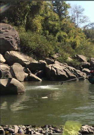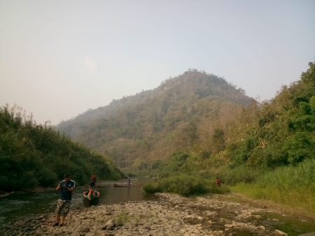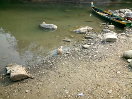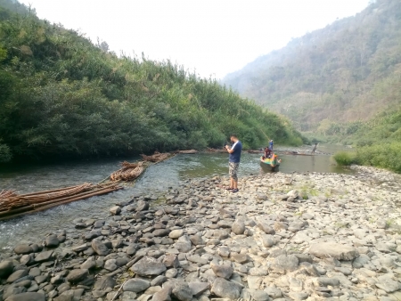 নদীর পানি এখন অনেক কম । শীতকালে পানি কম থাকে । বেশির ভাগ স্থানেই আমরা নিচের পাথর দেখতে পারছিলাম । এবং আমাদের নৌকার সাথে সেই পাথরের ঘষা লাগছিলো প্রতি মুহুর্তেই । এইবার এই যাত্রা পথে আমি বেশি ছবি তুলি নি । তার থেকে বরং দুই পাশের দৃশ্য উপভোগ করছিলাম একভাবে । মাঝে এমন একটা স্থানে এসে হাজির হলাম যেখানে পানি কমে গেছে একেবারে । এখানে নৌকাতে বসে করে যাওয়া সম্ভব না । আমরা নেমে গেলাম । মাঝি সেটা ঠেকে উপরে নিয়ে যেতে থাকলো ।