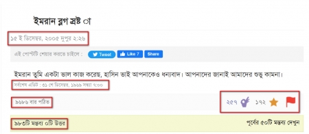 এখনও পর্যন্ত পোস্টটি পড়া হয়েছে ৯৬৮৬ বার । লাইক দেওয়া হয়েছে ২৫৮ টি এবং প্রিয়তে নিয়েছেন ১৭২ জন । এছাড়া এখনও পর্যন্ত মন্তব্য পড়েছে ৯৮৩টি যার একটিও উত্তর দেওয়া হয় নি । এখানে আরেকটা মজার ব্যাপার বলি । এই পোস্টটি করা হয়েছিলো ২০০৫ সালের ডিসেম্বর এবং এই পোস্টে প্রথম মন্তব্য পড়েছে কবে জানেন?