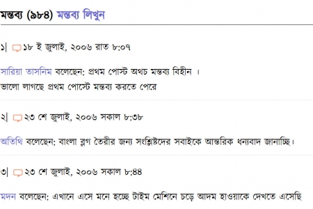 প্রায় সাত মাস পরে । ২০০৬ সালের জুলাই মাসে । প্রথম মন্তব্যটি করেন সারিয়া তাসনিম নামের একজন । তিনি মন্তব্য করেন ''প্রথম পোস্ট অথচ মন্তব্য বিহীন । ভালো লাগছে প্রথম পোস্টে মন্তব্য করতে পেরে ।''