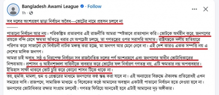 ফেসবুকে রাজনৈতিক পেইজ আমি ফলো করি না খুব একটা। তবে আমার লিস্টের অনেকেই ফলো করে। ফলে আমার হোমপেইজে মাঝে মাঝেই নানান রকম পোস্ট এসে হাজির হোয়। সেই রকম একটা পোস্ট গতদিন এসে হাজির হয়েছিল। আমি হয়তো পোস্টটা না পড়েই ক্রল করে চলে যেতাম কিন্তু প্রথম লাইনটা পড়েই মনে হল এই পোস্ট পড়তেই হবে। আওয়ামীলীগ তার অফিশিয়াল পেইজে পোস্ট দিয়ে বলতেছে, সব দলের অংশগ্রহন ছাড়া নির্বাচন অবৈধ! আমার মনে হল আমি ভুল দেখলাম! পেইজটা কি হ্যাক হল? আবার একবার ভাবেন! আওয়ামীলীগ বলতেছে সব দলের অংশগ্রহন ছাড়া নির্বাচন অবৈধ!