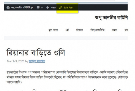 অপু তানভীর বলেছেন: লেখা এডিটের সুযোগ আছে তো। আপনি যখন লগিন অবস্থায় থাকবেন তখন আপনার পোস্টে ঢুকলেই মাথার উপর একটা এডিট অপশন দেখতে পাবেন। নিচের ছবিটার দিকে তাকান। এখানে এডটে ক্লিক করলেই এডিট পাতায় নিয়ে যাবে আপনাকে।