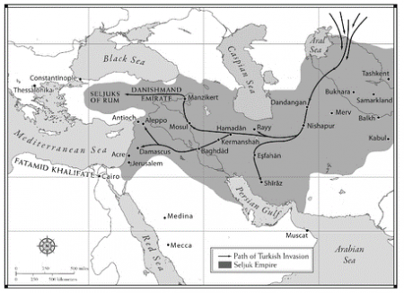 মানচিত্রে সেলজুক সাম্রাজ্য (কালো তীর চিহ্নিত লাইন দিয়ে দেখানো হয়েছে তুর্কীরা কোন পথে মুসলিম এলাকায় অভিযান চলিয়েছিল)