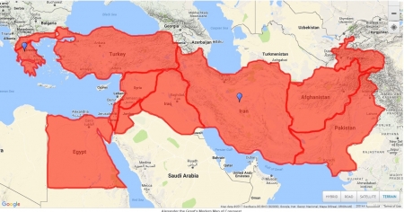 এখানে আলেকজান্ডারের রাজত্ব আধুনিককালের ম্যাপ এর উপর দেখানো হয়েছে। লক্ষ্য করে দেখুন মানচিত্রের একেবার বামদিকে নীল পিনটি যেখানে (গ্রিস) সেখানে তাঁর বাড়ি। তিনি পশ্চিমে (ইউরোপ) এক পাও বাড়াননি। ম্যাপ দেখে মনে হয় যেন ঊর্ধ্বশ্বাসে শুধু পূর্ব দিকে ছুটেছেন (একেবারে ভারত পর্যন্ত)। দক্ষিনেও একটু গিয়েছিলেন (মিশর)। আর লেখকের কথাই ঠিক- একেবারে পশ্চিমের সামান্য জায়গা ছাড়া এই পুরো এলাকাটাই (মিশর সহ) পারস্য সাম্রাজ্যের কব্জা থেকেই আলেকজান্ডার দখল করে নিয়েছিলেন।