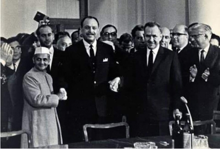 ২। তাশখন্দ চুক্তি দস্তখতের পর ত্রিপক্ষীয় মোসাফা করছেন ভারতের প্রধানমন্ত্রী লাল বাহাদুর শাস্ত্রী, পাকিস্তানের প্রেসিডেন্ট আইয়ুব খান এবং সোভিয়েত ইউনিয়নের প্রধানমন্ত্রী অ্যালেক্সেই কোসিজিন। শাস্ত্রীর পেছনে তাৎপর্যপূর্ণ মুখভঙ্গিতে দাঁড়িয়ে থাকতে দেখা যাচ্ছে পাকিস্তানের পররাষ্ট্রমন্ত্রী জুলফিকার আলী ভুট্টোকে।