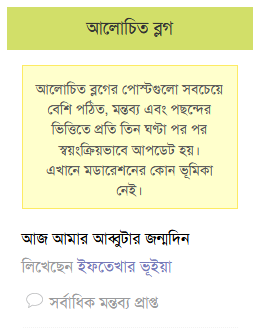 বহুকাল আগে কোন একটা লিখার জন্য একবার সর্বাধিক পঠিত সেকশনে একটা লিখা এসেছিলো। কোন লিখাটা বা কেন সেটা মনেও করতে পারছিনা। সামুতে লিখালিখি শুরু করেছিলাম ২০০৬-এ। এতদিনে মনে হয় একটা বা দু'টো লিখা এসেছিলো ঐ সেকশনটায়। যাইহোক, পুত্রের জন্মদিনের কল্যানে আমার গত লিখাটা একটু আগেই আলোচিত ব্লগ এর "সর্বাধিক মন্তব্য প্রাপ্ত" ব্লগ সেকশনে এসেছে। ভালো লাগছে বৈ কি! এখনতো মনে হয় প্রতি বছরই পুত্রের জন্মদিনে একটা করে লিখা পোস্ট দিতে হবে।