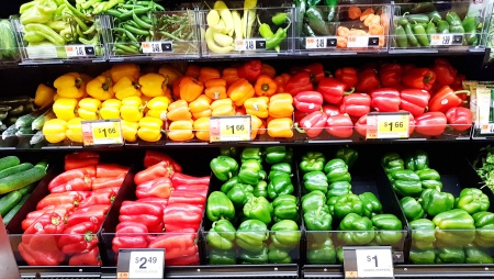 সবুজ হলুদ লাল হা হা হা প্রায় রেইনবো কালারের ক্যাপসিকাম সাথে কাঁচামরিচ ।