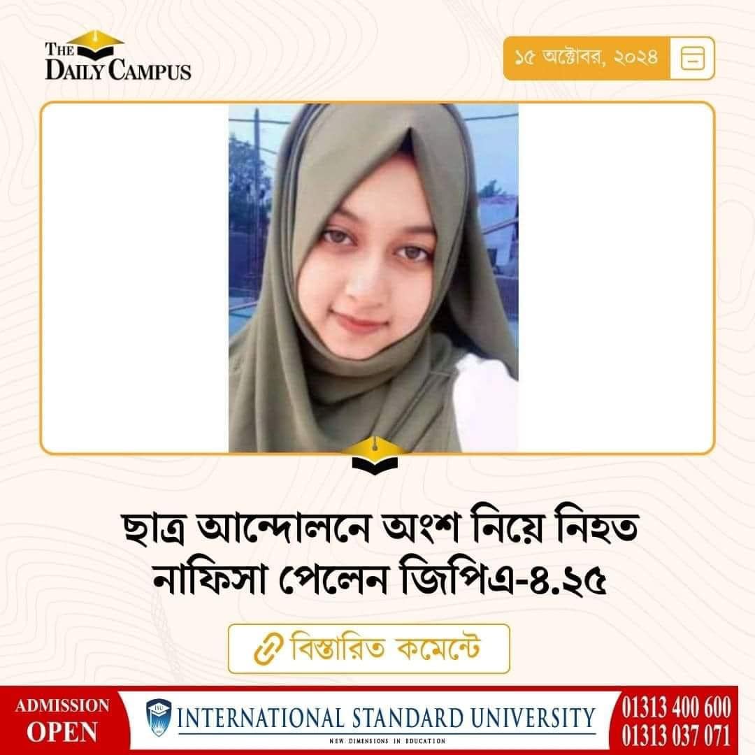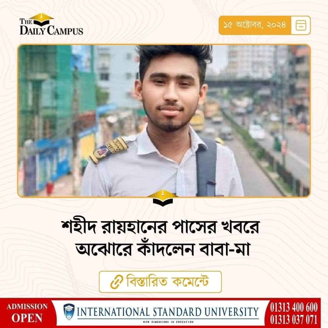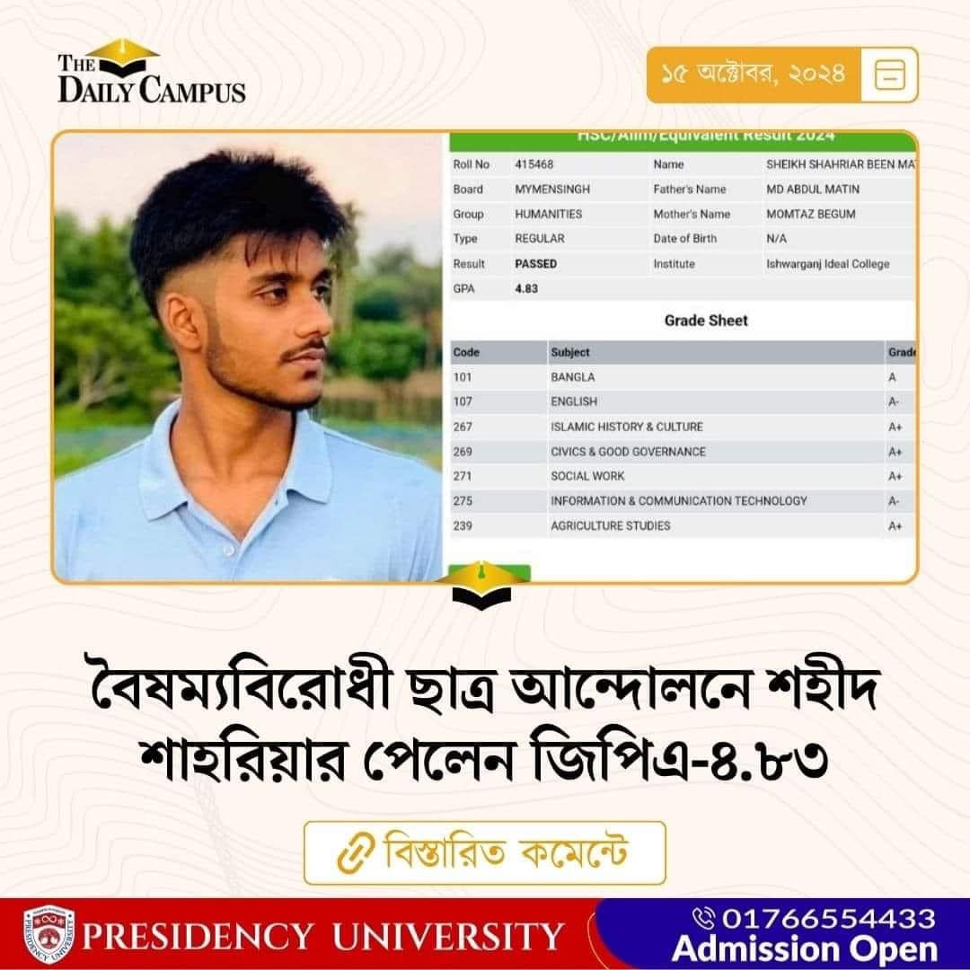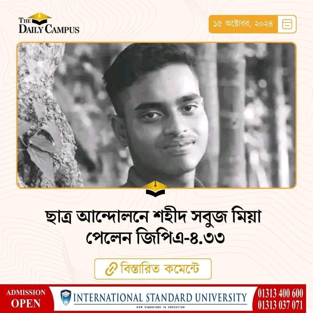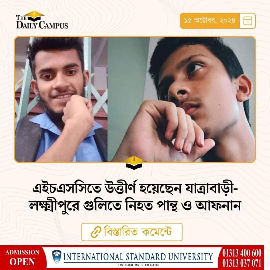 বৈষম্যবিরোধী ছাত্র আন্দোলনে নিহত হওয়া বেশকিছু পরীক্ষার্থী এইচএসসি পরীক্ষায় উত্তীর্ণ হয়েছে। তাদের কয়েক জনের ছবি দেখতে পেলাম ফেসবুকে।