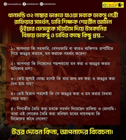 ধানমণ্ডি ৩২ নম্বর আবার ভাঙতে যাবার অর্থ হলো, জামাত ও মৌলবাদীদের প্রতিপক্ষ হাসিনা, হাসিনার স্বৈরশাসন বা আওয়ামী লীগের গুম-খুন-লুটপাট নয়। তাদের প্রকৃত প্রতিপক্ষ মুক্তিযুদ্ধ ও বাঙলা সংস্কৃতি। মুক্তিযুদ্ধে বাঙালি জাতির যে আত্মঅন্বেষণ ও সাংস্কৃতিক চেতনার উদ্ভাসন ঘটেছিল, যার কেন্দ্রে ছিল সব ধর্ম ও শ্রেণির মানুষ, সেই জায়গাটাই জামাতের বিরোধের মূল কেন্দ্র।