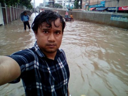 গতকাল সারাদিন অফিসের কাজে বাইরে গিয়ে বৃষ্টিতে ভিজেছি। কাজ শেষ করে বাসায় ফিরছি। ভাঙ্গা, খানা-খন্দে ভরা রাস্তায় পানি জমে গেছে। কোনো কোনো জায়গায় কোমর পর্যন্ত পানি। খুব বেগ পেতে হচ্ছে। আধা ঘন্টা দাঁড়িয়ে থেকেও বাস পাইনি। ইফতারির আগে বাসায় যেতে পারলেই আমি খুশি। এর মধ্যে আমার এক বন্ধু ফোন করে বলল- এমন বৃষ্টি মুখর দিনে নিশ্চয়ই খিচুরি খেয়ে ঘুমাচ্ছো? আমি মনে মনে বন্ধুকে বললাম- ছাগল। বাংলামটর থেকে হেটে হেটে বাসায় ফেরার পথে রাজারবাগ পুলিশ লাইনের সামনে ছবিটি তুলি। বিশেষ করে মগবাজার থেকে রাজারবাগ মোড় পর্যন্ত ভয়াবহ অবস্থা। অবশ্য দশ বা বিশ বছর আগেও এই রকম অবস্থা ছিল। এখন, কথা হচ্ছে, তাহলে এত গুলো বছরে সরকারের লোকজন কি কাজ করলো?
