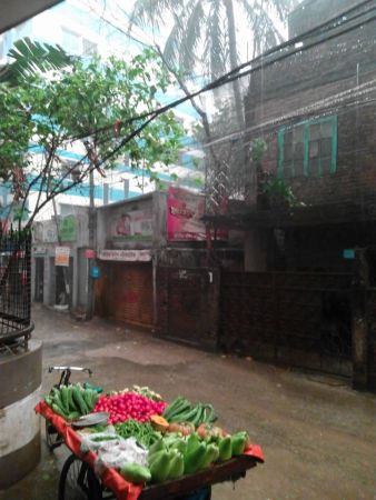 ১২। সেদিন অফিস থেকে হেঁটে হেঁটে বাসায় ফিরছিলাম। কথা নেই, বার্তা নেই শুরু হলো বৃষ্টি। এক লোক ভ্যানে করে সবজি বিক্রি করছিল। বৃষ্টি নামতেই লোকটা কোথায় যেন চলে গেল। দেখুন পানি পেয়ে সবজি গুলো কেমন চকমক করছে।