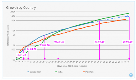 বর্তমান পরিস্থিতিতে আমার ধারণা , ২০শে জুনের কাছাকাছি সময়ে দেশে আনুমানিক মোট ১০০,০০০ বা ১ লক্ষ (প্রায়) করোনায় আক্রান্ত রোগী শনাক্ত হওয়ার সম্ভবনা (উপরের চিত্র)। আর ঢাকা হচ্ছে দেশের করোনাভাইরাসদের হেডকোয়ার্টার। আশাকরি সেইভাবেই মানসিক প্রস্তুতি রাখবেন।
