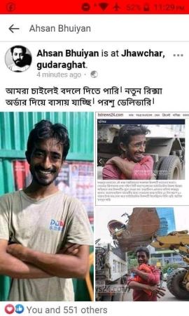 সোমবার জিগাতলায় ঢাকা দক্ষিণ সিটি করপোরেশনের ব্যাটারিচালিত রিকশা উচ্ছেদ অভিযানে ফজলুরের রিকশাটিও তুলে নেওয়া হয়। করোনাভাইরাস মহামারীর মধ্যে দোকানের কাজ হারিয়ে ১৫ দিন আগে ৮০ হাজার টাকা ধার-দেনা করে ব্যাটারিচালিত রিকশাটি কিনেছিলেন। এই ছবিটা দেখার পর থেকে আমার প্রচন্ড খারাপ লাগছে। উনার পরিবার আজ হয়তো না খেয়ে থাকবে। উনার যে বাসস্থানে থাকে সেটার ভাড়া কিভাবে দিবে? সন্তান আছে কি? ওরা পড়বে না তাহলে আর? কাকে দোষ দিবো? দেশ, রাষ্ট্র, ঈশ্বর নাকি? ওরে তোরা দুর্নীতিবাজদের ধর।