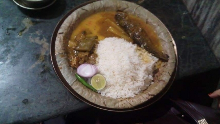 পাতা দিয়ে তৈরি থালায়- ভাত,মাছ,তরকারি