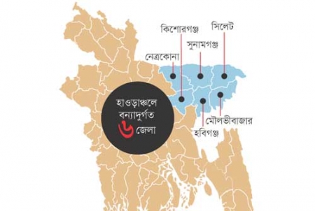 ৬। আকস্মিক প্লাবনে সরাসরি ক্ষতিগ্রস্ত হয়েছে হাওড়াঞ্চলের ৩ লাখ ৩০ হাজার পরিবার। সুনামগঞ্জ ত্রাণ ও পুনর্বাসন কর্যালয়ের তথ্যমতে, জেলায় আসা ৫২ লাখ টাকার ত্রাণের মধ্যে ৪৮ লাখ টাকা উপজেলা হয়ে ইউনিয়ন পরিষদের কাছে গেছে। জেলা সদরে নয়টি ও উপজেলাগুলোয় ৩৩টি বুথ খুলে ওএমএসের চাল ও আটা বিতরণ করা হচ্ছে। নেত্রকোনায় খয়রাতি সহায়তা দেয়া হয়েছে ৩২৭ টন চাল ও নগদ ২১ লাখ টাকা।
