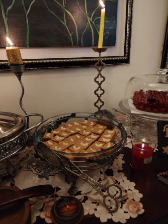 ইফতার পার্টির যে ছবি দিয়েছো তার প্রথম ছবিটাতে কি আছে? গ্লেজড চেরী? মনে হয় রংয়ের বিচারে ইফতারে এই আইটেম যোগ করেছ। খাবারের সামনে রাখা তসবিটার ভূমিকা বুঝলাম না। দেয়ালে ঝুলন্ত তোমার ছিল শিল্প কর্ম বুঝি? চমৎকার এঁকেছ!