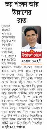 রাত ৪টার পর আবার গুলাগুলির আওয়াজ শোনা যায়। আতঙ্ক ছড়িয়ে পড়ে আমাদের মধ্যে। বেশ কয়েকটা যুদ্ধ বিমান আমাদের ডর্মের পাশ দিয়ে প্রচণ্ড আওয়াজে উড়ে যায়। মনে হচ্ছিল, যেন আমাদের ওপরই বোমাবর্ষণ হচ্ছে। ভয়ে সবাই দৌড়ে বাইরে বেরিয়ে আসি। এর কিছুক্ষণ পর পুনরায় আসে তুর্কি প্রধানমন্ত্রীর পুন:ঘোষণা। তিনি জানান, কিছু বিপথগামী কয়েকটি বিমান দখল করে এসব করছে। ব্যবস্থা নেয়া হচ্ছে। এরই মাঝে টটেলিভিশনগুলোতে লাইভ কথা বলেন এরদোয়ান। তাকে ঘিরে রেখেছে সমর্থকরা। এভাবেই ভোর আসে, বিদ্রোহিতের জন্য বিষাদ আর এরদোয়ান সমর্থকদের জন্য হাসি নিয়ে।