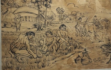 পেছনের দিকে দেখা যায় কুঁড়েঘর, গাছপালা এবং গরু দিয়ে হাল চাষের দৃশ্য—যা কৃষিভিত্তিক সমাজের সামগ্রিক জীবনচিত্র তুলে ধরে। মানুষের শ্রম, প্রকৃতির সঙ্গে সহাবস্থান এবং গ্রামীণ জীবনের আত্মমর্যাদা এই চিত্রে অত্যন্ত শক্তিশালীভাবে প্রকাশ পেয়েছে। রঙের পরিবর্তে রেখার ব্যবহার (ড্রইং/স্কেচ স্টাইল) চিত্রটিকে আরও নৈপুণ্যময় ও সময়ের সাক্ষী করে তুলেছে।