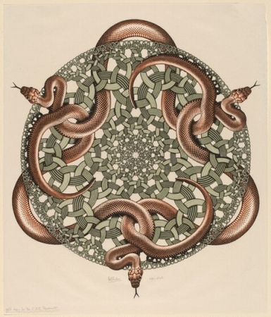 Snakes, 1969, woodcut in orange, green, and black, printed from three blocks Cornelius Van S. Roosevelt Collection All M.C. Escher works