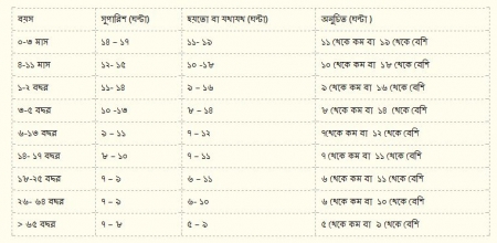 আমাদের সবার মাঝেই একটা ধারনা কাজ করে যে একজন প্রাপ্তবয়স্ক মানুষের জন্য দৈনিক ৬ ঘণ্টা ঘুমই যথেষ্ট। কিন্তু এই ধারনাটি সম্পূর্ণ ভুল ধারণা। অ্যামেরিকার ন্যাশনাল স্লিপ ফাউন্ডেসন এর ২০১৪ সালের একটি আর্টিকেল অনুযায়ী বয়স ভেদে ৭ থেকে ১৭ ঘণ্টা ঘুম প্রয়োজন। নিচের টেবিলে তাদের বয়স ভেদে ঘুমের সময়ের প্রয়োজনীয়তার সুপারিশটি দেখানো হল।