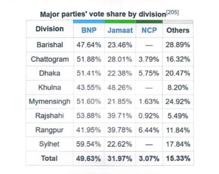 বিজয়ী দল : বিএনপি ................ প্রাপ্ত সংসদীয় আসন : ২০৭................প্রাপ্ত ভোটের হার : .৪১.১৭%....