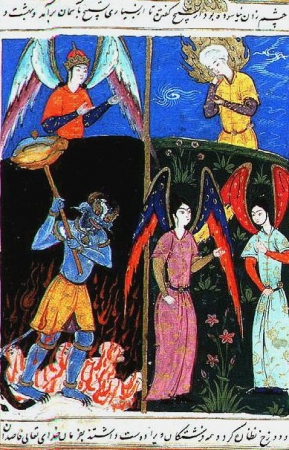 ইদ্রিস নবীর একটি আলোকিত হস্তলিখিত সংস্করণ থেকে স্বর্গের এবং জাহান্নাম পরিদর্শন একটি কল্পিত চিত্রকর্ম