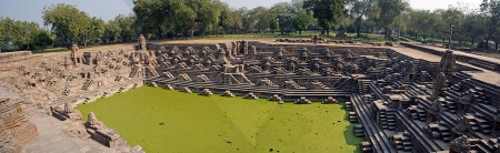 মন্দিরের ছিল তিনটি প্রধান অংশঃ সূর্য কুণ্ড,সভা মণ্ডপ ও গুরা মণ্ডপ। জলাধারের কেন্দ্রে পৌছাতে চারটি দেয়াল পার হতে হয়।ছোট পিরামিড আকৃতির ধাপ দিয়ে এই দেয়াল গুলো সর্জিত।বিভিন্ন দেব দেবীর ভাস্কর্য দিয়ে এই দেয়াল গুলোর গায়ের পাথরে খোদাইকৃত ভাবে সর্জিত করা। সোলাঙ্কি রাজত্ব কালে ভগবান বিষ্ণু ও শিব এবং দেবী শীতলমাতার বিস্ময়কর সুন্দর ভাস্কর্য তৈরি হয়েছিল।সভা মণ্ডপের প্রবেশ পথে দুটি কারুকার্যময় তোড়ন আকৃতির খিলান রয়েছে।