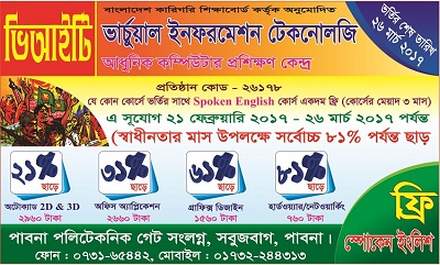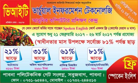 ভার্চুয়াল ইনফরমেশন টেকনোলজিতে চলছে ভাষা ও বিজয়ের মাস উপলক্ষে বিশেষ ছাড় ও সেই সাথে প্রতিটি শিক্ষার্থি যে কোন কোর্সে ভর্তিতে পাবেন বিনামূলে ৩ মাস মেয়াদী Spoken & Learning English Course ফ্রি শেখার সূযোগ।