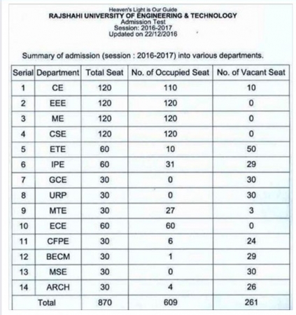 রুয়েট ভর্তির জন্য ছাত্র খুজে পাচ্ছে না।ব্যাপারটা এমন নয় যে রুয়েট উচ্চ মানসম্পন্ন ছাত্র খুজে পাচ্ছে না।বরং পরিক্ষার্থীরা রুয়েটের নিম্ন মানস্মপন্ন ডিপার্টমেন্টগুলোকে বর্জন করেছে।রুয়েটে ৮৭০ টি আসনের জন্য ভর্তি পরিক্ষায় পাস করা ২৪৯৮ জনকে ডাকা হয়।(ফিফথ ওয়েটিং পর্যন্ত)।কিন্তু তারপরও ২৬১ টি আসন শুন্য থেকে যায়।গ্লাস এন্ড সিরামিক,ম্যাটেরিয়াল সাইন্স,আরবান এন্ড রিজিওনাল প্ল্যানিং ইঞ্জিনিয়ারিং এর ৩০ টি করে ৯০ আসন শুন্য রয়ে গেছে।অথচ ভর্তি প্রক্রিয়া শেষ।